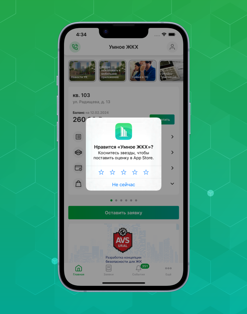 Запрос происходит при попадании на экран успешного действия (создана заявка, переданы показания, создана заявка на добавление объекта)