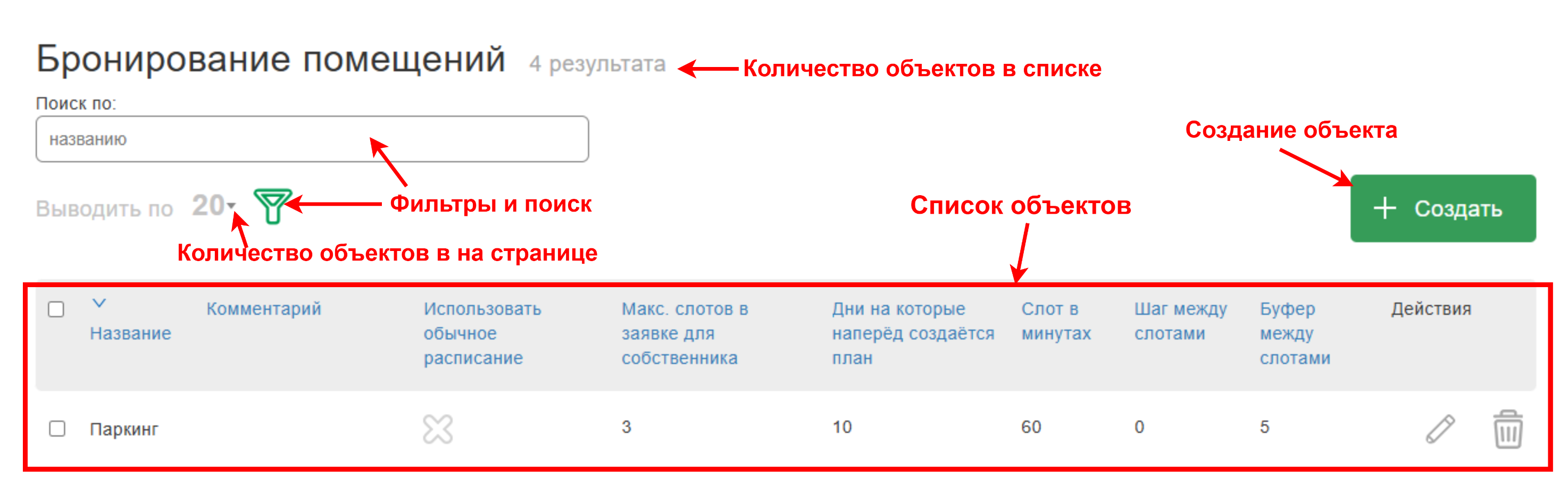 Список объектов разделен на страницы (если помещений больше 20), количество объектов на одной странице регулируется соответствующей настройкой.