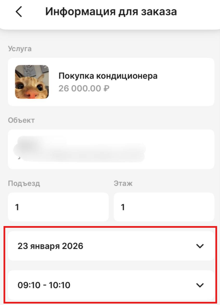 После добавления бронируемого помещения к услуге, в форме заказа появятся поля для выбора даты и времени: