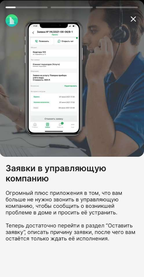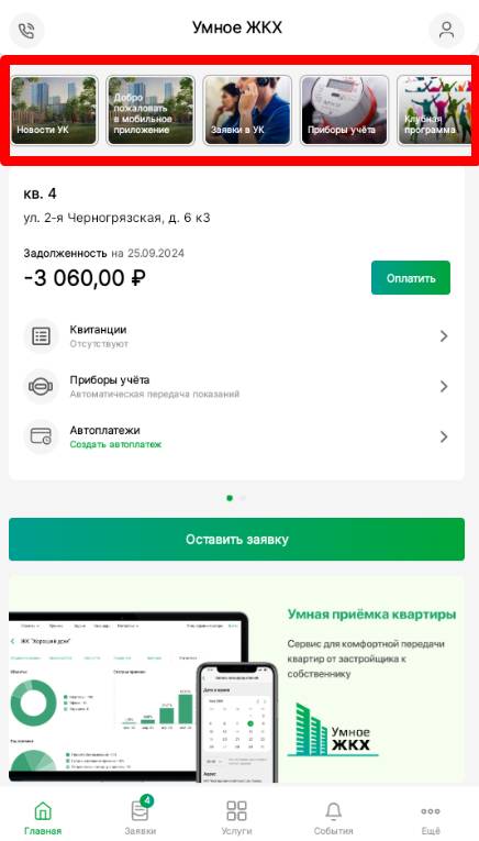 1. Сторис (Stories) - аналог сторис в соцсетях. Отображаются в верхней части главной страницы мобильного приложения жителя: